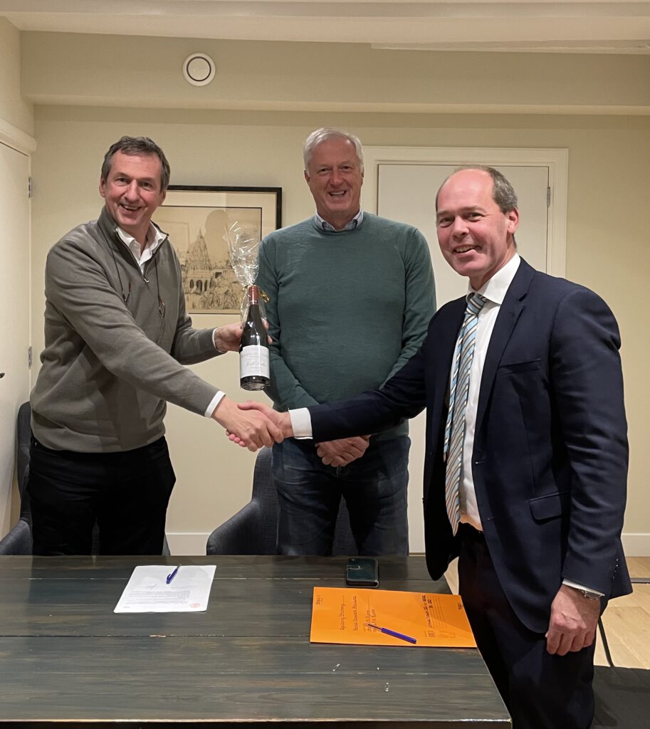 De Stichting Behoud Dorpskerk Abcoude is opgericht, met welwillende medewerking van notaris Jan Derkman (rechts), die bij deze gelegenheid de andere, traditionele primeur op de derde donderdag van november (Beaujolais) kreeg overhandigd. Gerard Bolder (voorzitter – midden) en Vincent Pijpers (secretaris / penningmeester – links) gaan aan de slag, dankzij en samen met de vele vrijwilligers en dorpsgenoten, die het oudste monument van De Ronde Venen een warm hart toedragen. Zie ook onze actuele nieuwsbrief